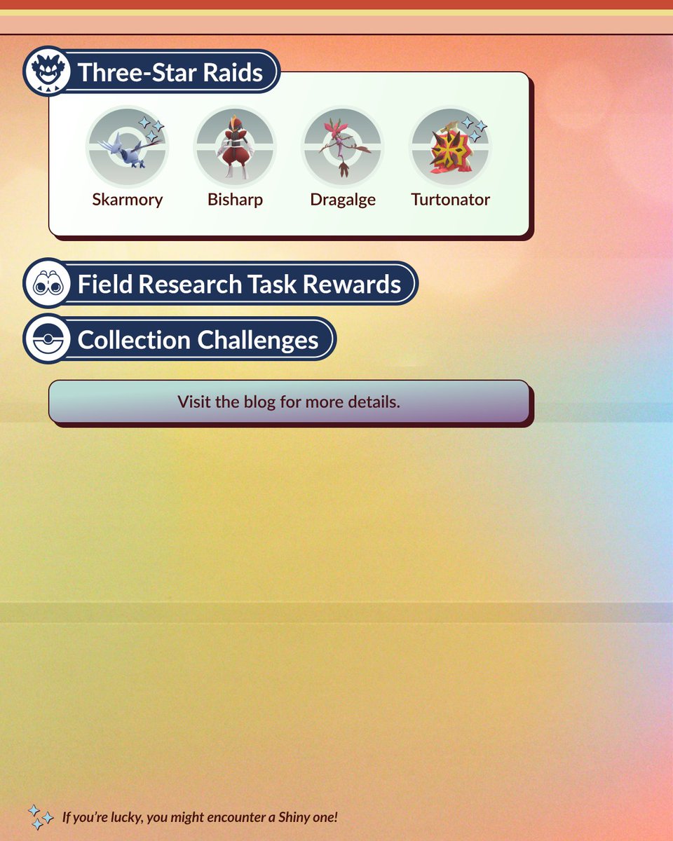 - 3 sterren raids: Skarmory, Bisharp, Dragalge en Turtonator.