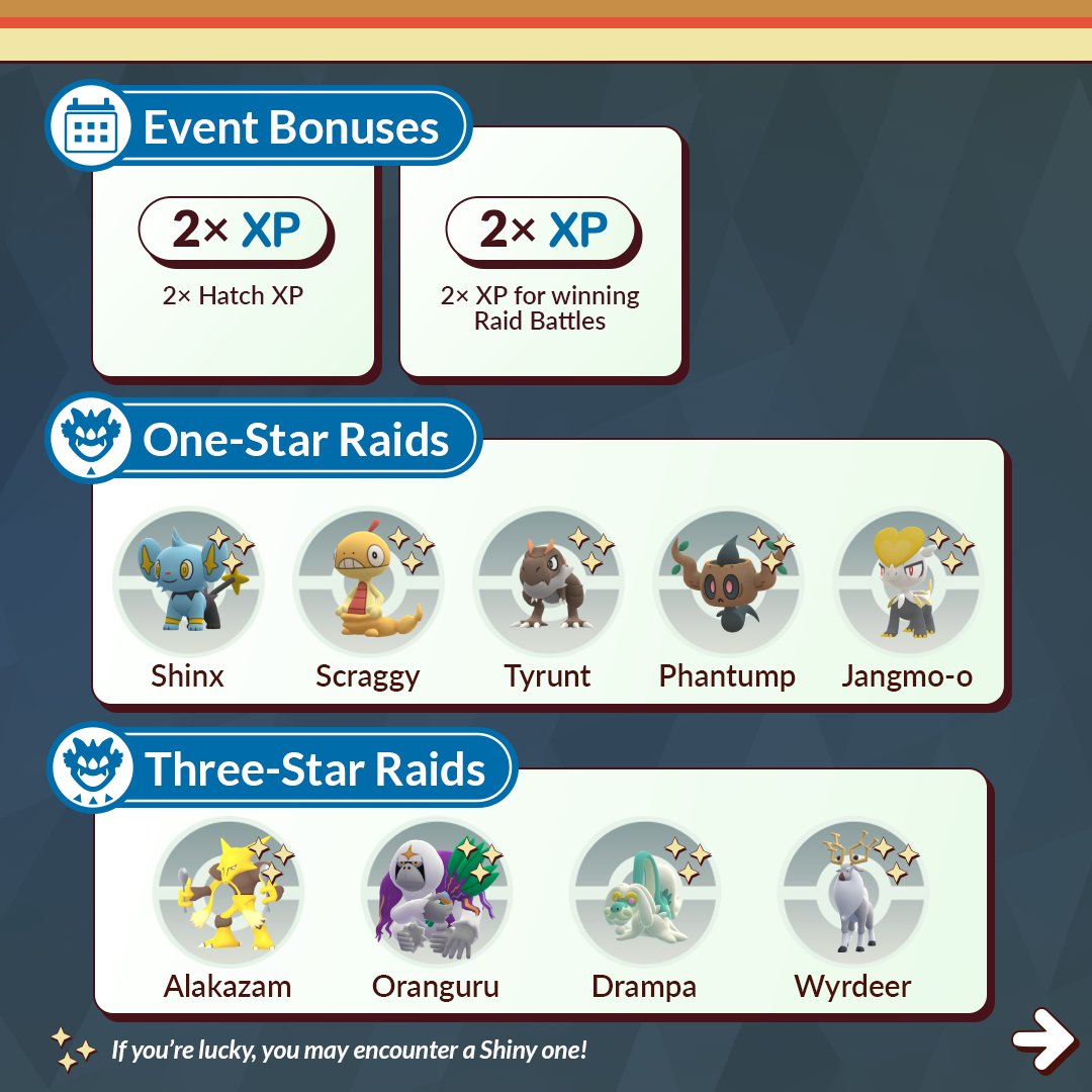 - 1 ster raids: Shinx, Scraggy, Tyrunt, Phantump en Jangmo-o;
