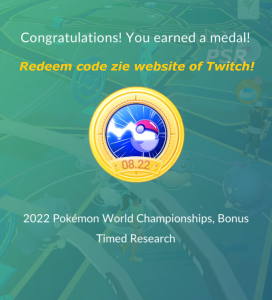 Er zal een code voor een Timed Research vrijgegeven worden tijdens de Pokémon GO World Championships Twitch uitzending. Deze code zullen ze in de chat tijdens deze uitzending bekendmaken. Het gaat om een tijdelijke Timed Research waarin je de fijne kneepjes van het battelen zal kunnen leren en daarbij een Great League team kan samenstellen.