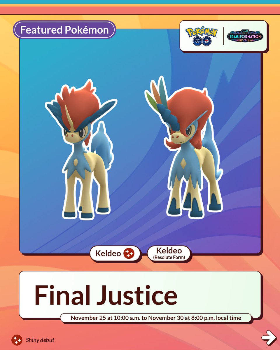 Op dinsdag start er weer een nieuw event en met dit event komt Keldeo in zijn Resolute Form naar het spel. Met de Seasonal Special Research verhaallijn kun je 50 Keldeo Candy vrijspelen voor het veranderen van Keldeo’s vorm. Het event start op 25 november om 10.00 uur lokale tijd en zal op 30 november om 20.00 uur lokale tijd eindigen.