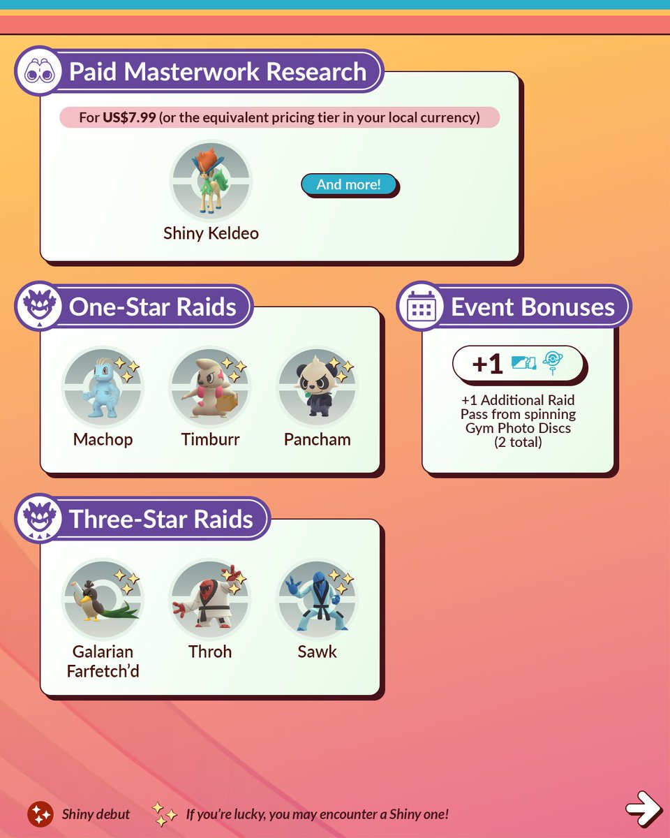 Uit de Field Research taken zijn de Pokémon Galarian Farfetch’d, Hisuian Lilligant, Throh en Sawk vrij te spelen. Ook kun je bij bepaalde Field Research taken Keldeo Candy als beloning krijgen!