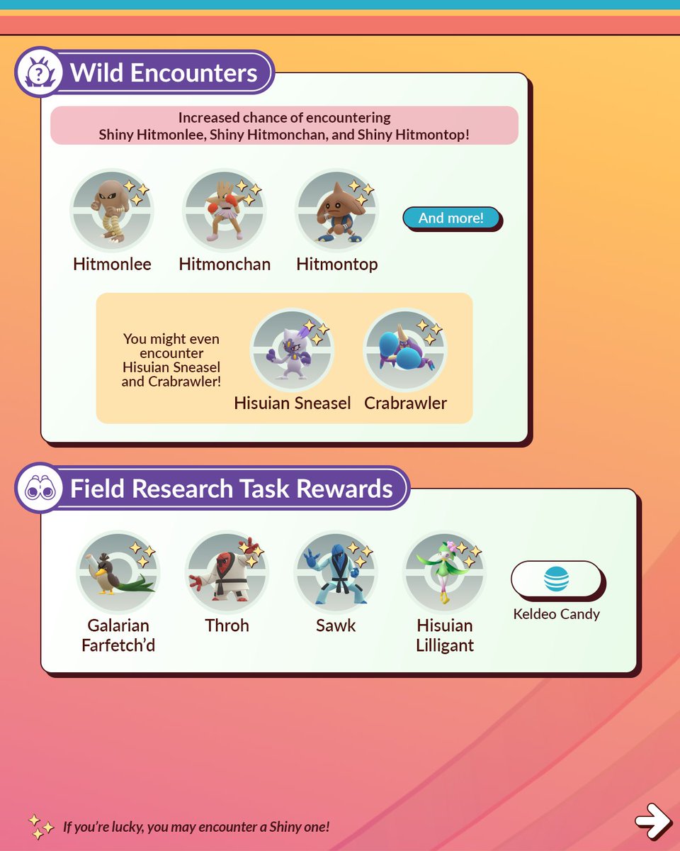 In het wild kun je veel Fight-type Pokémon tegenkomen. Zo zal Hitmonlee, Hitmonchan, Hitmontop, Hisuian Sneasel en Crabrawler meer in het wild voorkomen. De familie Hitmon zal een verhoogde kans om Shiny te zijn hebben!
