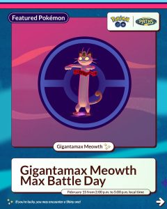 Op zondag 15 februari van 14.00 uur tot 17.00 uur lokale tijd kunnen we Gigantamax Meowth in de Max Battles aantreffen. Deze Pokémon maakt hierbij zijn Pokémon GO debuut en is ook gelijk Shiny te krijgen uit de Max Battles.