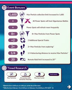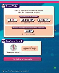 Er is voor iedereen een Timed Research beschikbaar. Deze staat in het teken van Max Battles doen en je ontvangt een encounter met Dynamax Machop, Candy en Max Particles. Deze kun je gebruiken om je team te versterken in de Battles tegen Gigantamax Meowth.