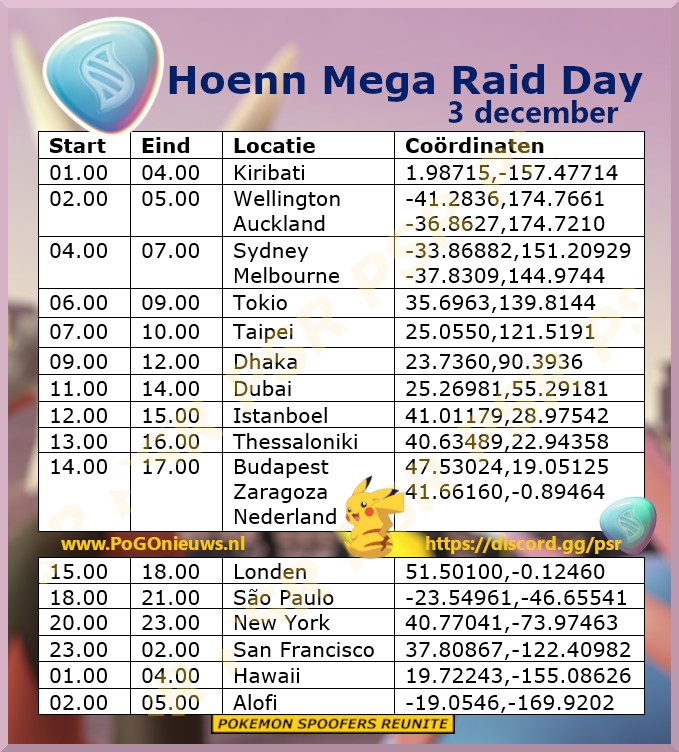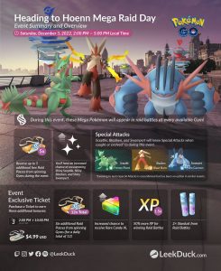 In het nieuwe seizoen Mythical Wishes krijgen we een Mega Raid Day en dit event zal plaatsvinden op 3 december tussen 14.00 uur en 17.00 uur lokale tijd. Met dit event komen 3 nieuwe Mega Pokémon voor het eerst in het spel. Het gaat dan om Mega Sceptile, Mega Blaziken en Mega Swampert. Deze Pokémon komen uit de Hoenn regio. Deze regio staat bij de volgende Pokémon GO Tour centraal.