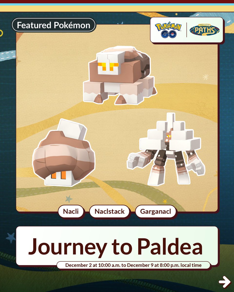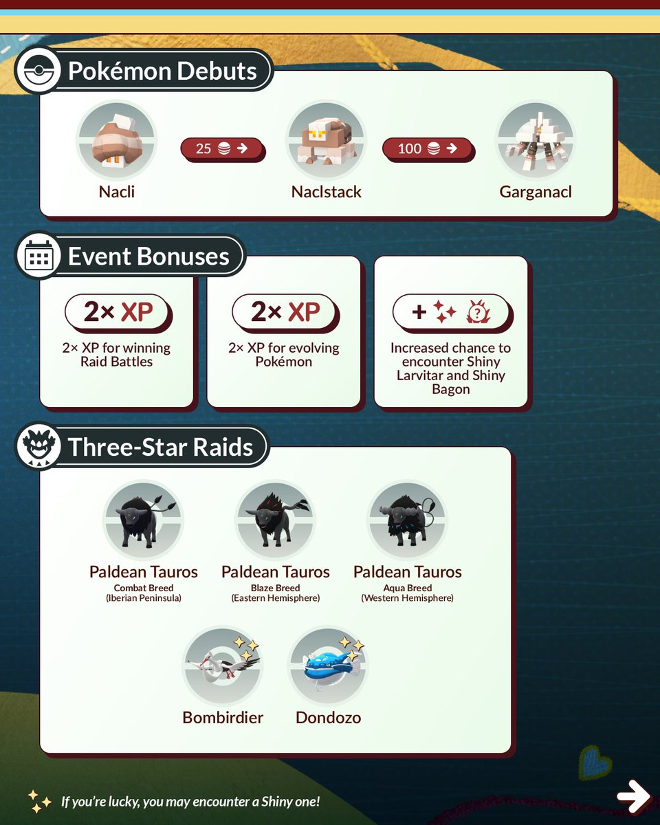 Met dit event zullen er 3 nieuwe Pokémon in het spel komen. We zullen de Pokémon Nacli in het wild tegenkomen en vanuit Nacli kun je Naclstack en Garganacl krijgen met evolueren.