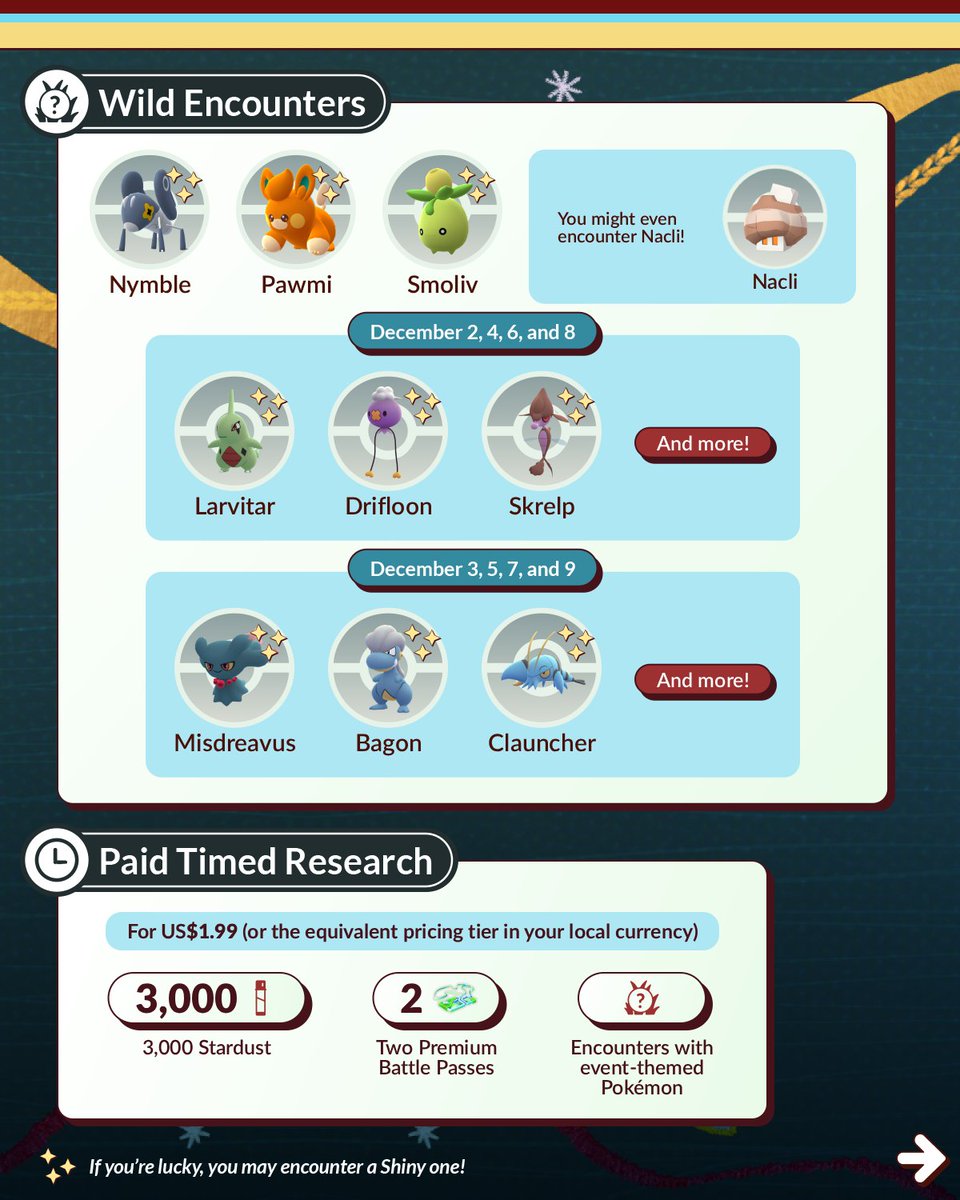 Tijdens het hele event kunnen we Nymble, Pawmi, Smoliv en Nacli in het wild tegenkomen. Er zullen ook Pokémon bepaalde dagen in het wild meer voorkomen. Het gaat om de volgende Pokémon en dagen: