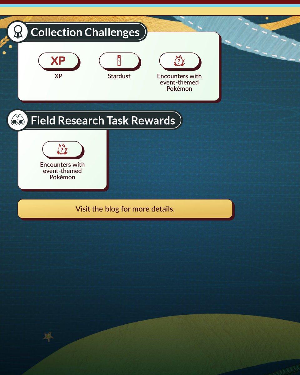 - Er zullen weer Collection Challenges zijn waarmee je XP, Stardust en Pokémon van het event kunt vrijspelen.