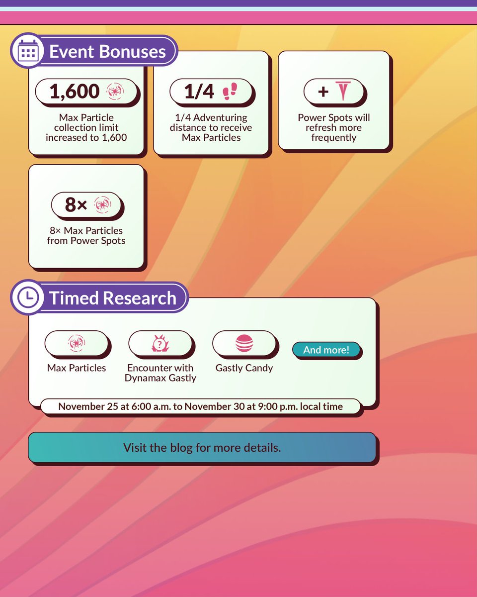 Vanaf 25 november zal er voor de trainers een gratis Timed Research beschikbaar zijn. Met deze research kun je Dynamax Gastly vrijspelen en deze Pokémon zal handig zijn in de Max Battles tegen Dynamax Lugia. Ook kun je Gastly Candy, Max Particles en andere hulp bij het samenstellen van je battle team kunnen krijgen. Deze research heeft een tijdslimiet en je zal de beloningen voor het einde van Max Battle weekend moeten claimen.