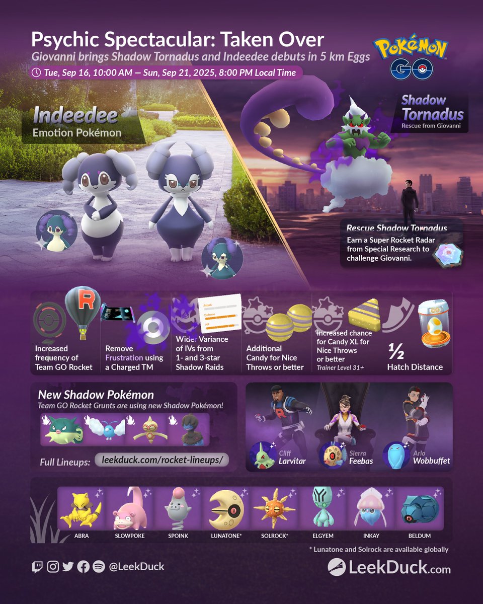 Op dinsdag 16 september om 10.00 uur start er weer een nieuw event en dit keer zal Indeedee zijn debuut maken. Deze Pokémon komt ook direct Shiny in het spel en is voor nu alleen uit eieren te verkrijgen. Ook kun je Shadow Incarnate Forme Tornadus uit de Special Research vrijspelen.