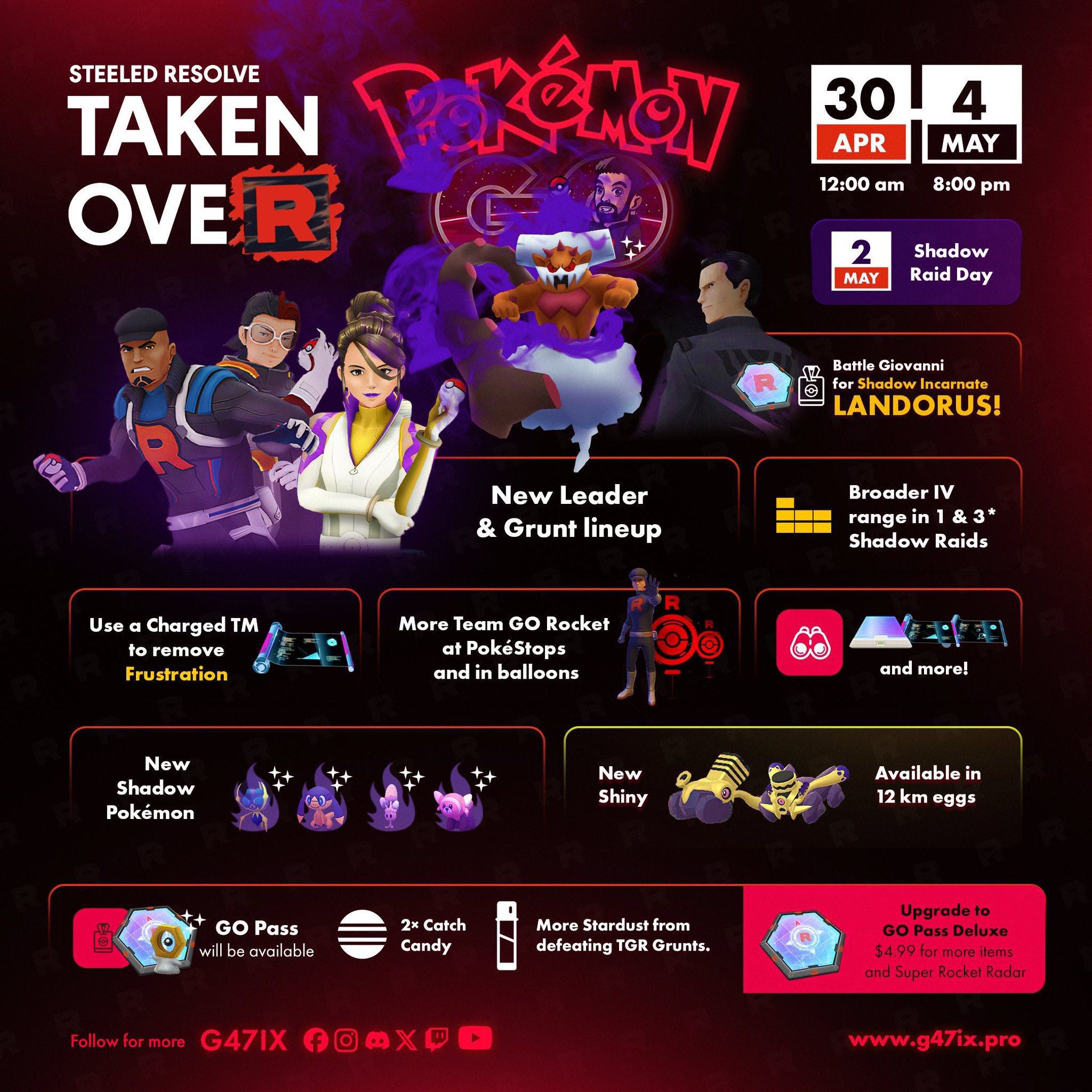 In het Steeled Resolve event krijgen we ook een Team GO Rocket Taken Over event. Vanaf 30 april tot 4 mei kunnen we weer meer Team GO Rocket in het spel tegenkomen. Giovanni neemt weer een nieuwe Pokémon in gijzeling, er zullen nieuwe Shadow Pokémon in het spel komen en Shiny Varoom is te hatchen uit 12 km eieren.