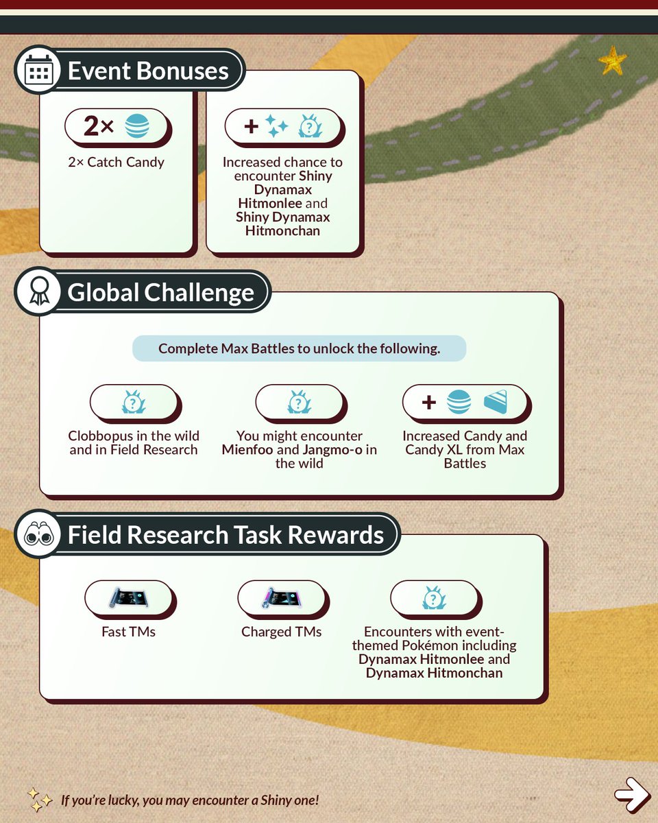 - Verhoogde kans om Dynamax Hitmonlee en Dynamax Hitmonchan in hun Shiny vorm vrij te spelen.