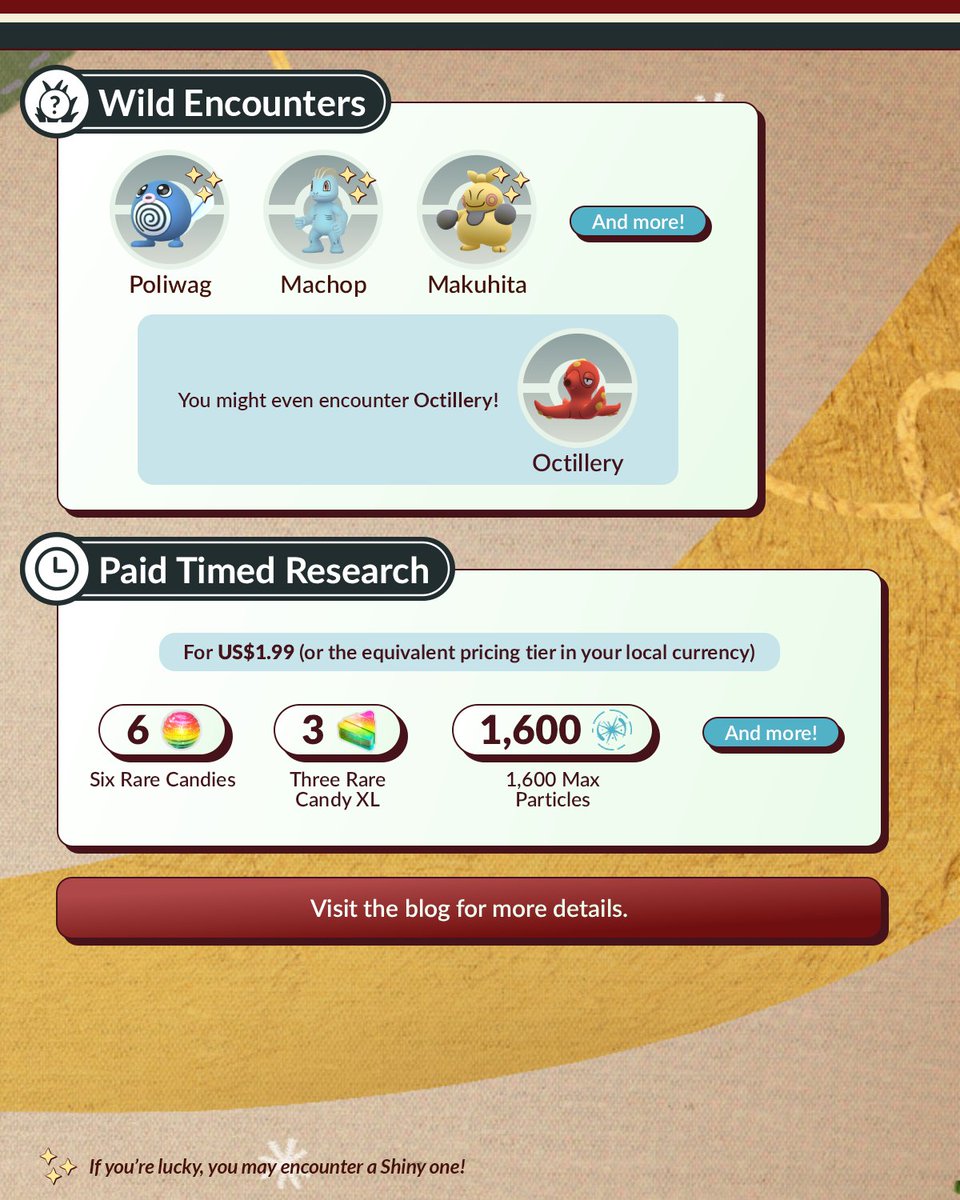 - De Pokémon Poliwag, Machop, Makuhita en Octillery kun je meer in het wild tegen komen;