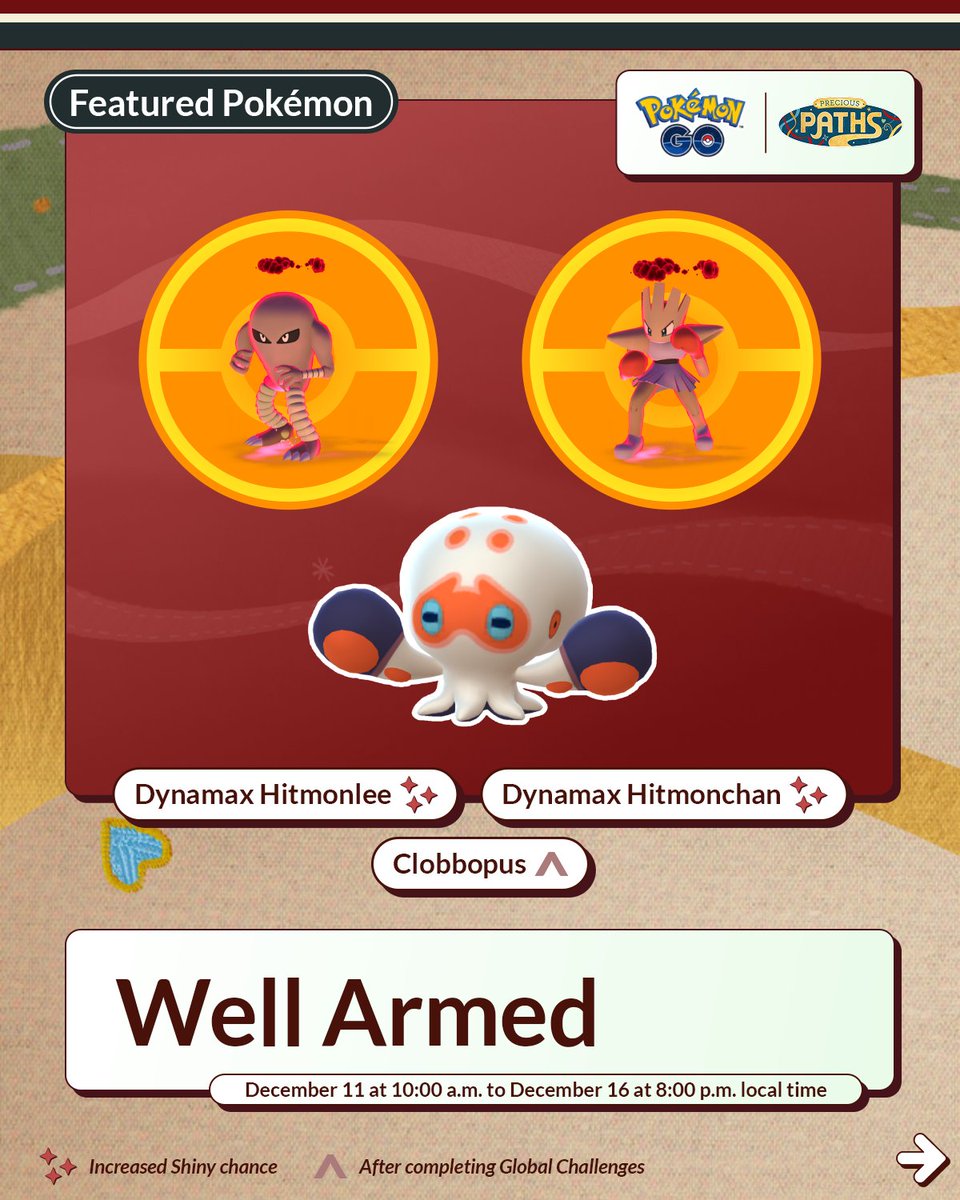Donderdag 11 december start er om 10.00 uur lokale tijd een nieuw event. Dit event heet Well Armed. Met dit event kan voor het eerst Clobbopus naar het spel komen. Deze Pokémon kunnen we dan in het wild en vanuit Field Research vrijspelen. Het event zal eindigen op 16 december om 20.00 uur lokale tijd.