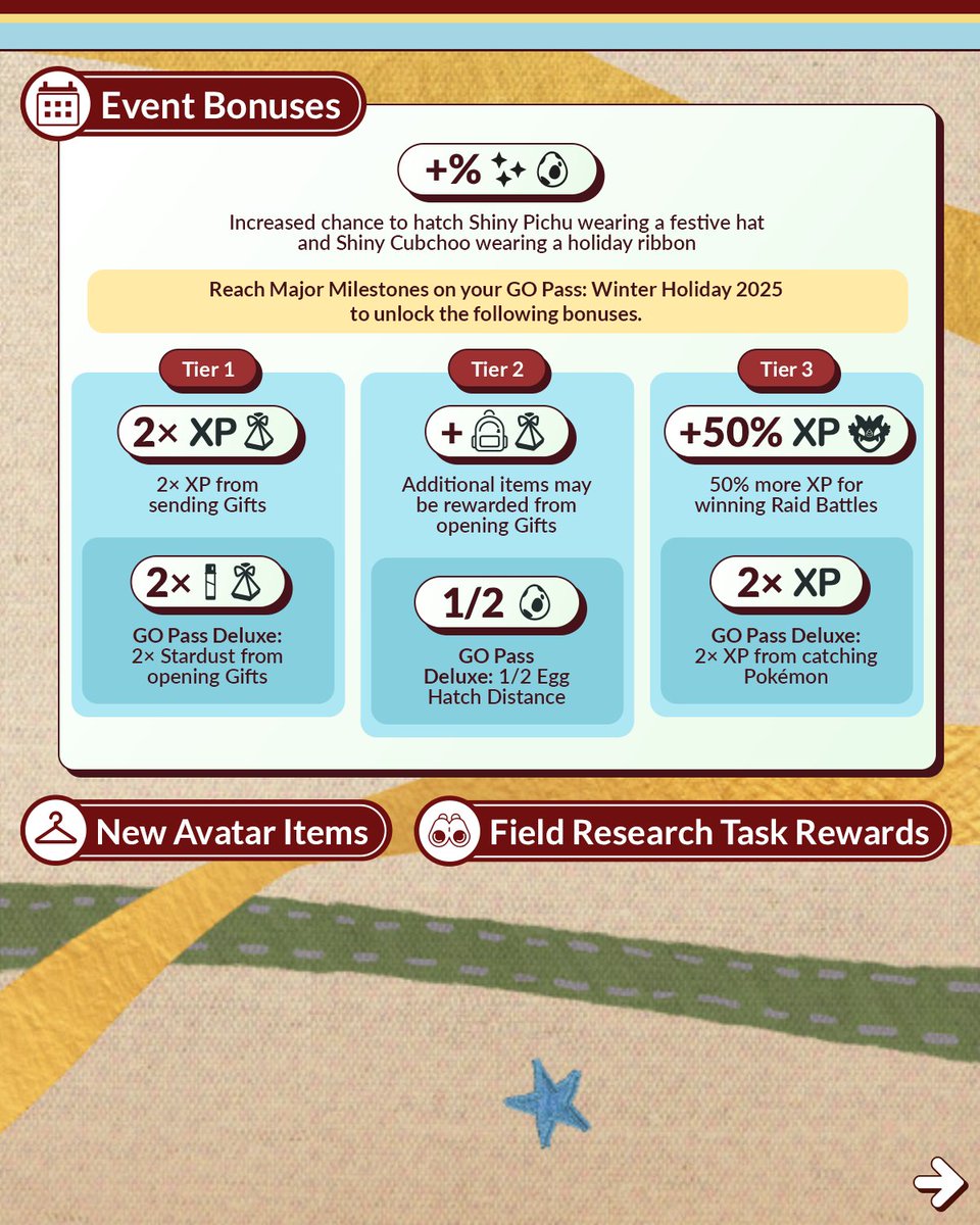 - Er is een verhoogde kans op het hatchen van Shiny Pichu met kerstmuts en Shiny Cubchoo met strikje. Ze zitten in de 7 km eieren.