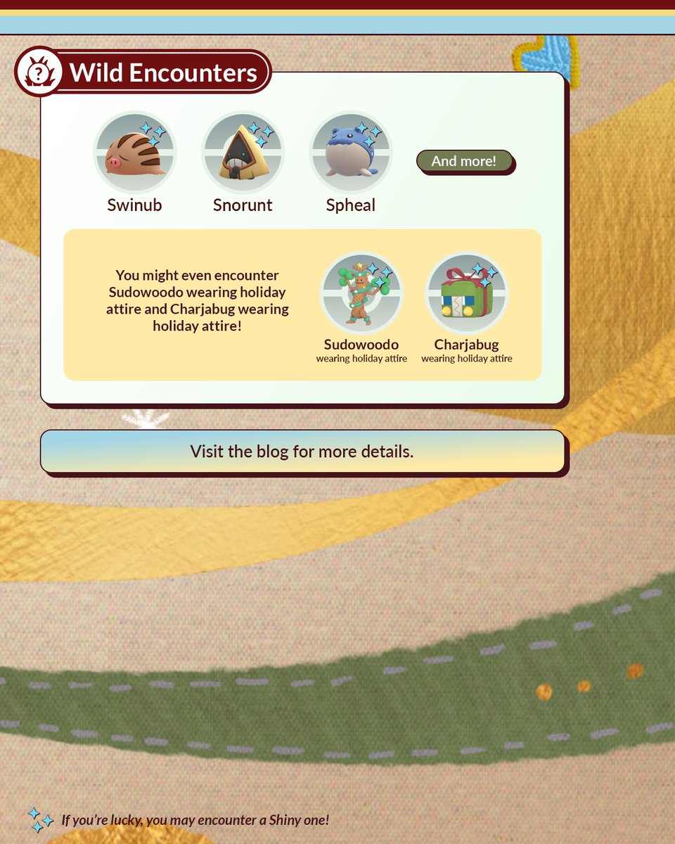 Er zijn weer verschillende Pokémon in het wild te vinden. Zo kunnen we meer Swinub, Snorunt en Spheal tegenkomen. Ook kunnen we voor het eerst in het spel Sudowoodo met kerstversiering en Charjabug met rode strik in het wild treffen! Deze Pokémon zijn allemaal Shiny te verkrijgen.
