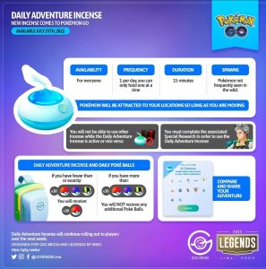 - Als je 30 of minder Poké Balls, Great Balls en Ultra Balls hebt, zul je 30 Poké Balls kunnen krijgen als je de Daily Adventure Incense aanzet. Er zal wel genoeg ruimte moeten zijn in de Item Bag voor deze 30 Poké Balls.