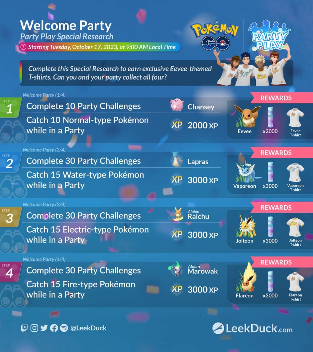 Als je een begin maakt met Party Play, krijg je de Special Research ‘Welcome Party’. Met deze research kun je 4 exclusieve Eevee shirts vrijspelen voor je groepsgenoten.