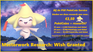 Vanavond om 19.00 uur zal een ticket voor de Masterwork Research: Wish Granted in de shop komen. Dit is een betaalde research waarmee je Shiny Jirachi kunt vrijspelen. Dit ticket is tot 20 maart te koop in de shop.